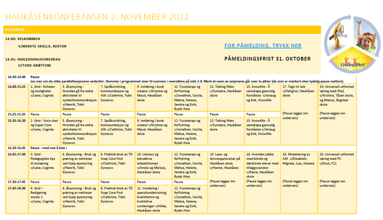 Skolen fyller 50 år dette skoleåret og det ønsket vi å markere blant annet ved å dele av vår kompetanse med andre skoler. Det overordnede temaet er hvordan vi kommuniserer med elever som trenger alternativ eller supplerende kommunikasjon (ASK). Tone Grøttum innledet det hele, og etterpå kunne deltakerne velge mellom 20 ulike workshops. De fleste workshopene ble holdt av våre egne ansatte, men vi hadde også eksterne gjester som bidro med kompetansedeling. Denne gangen inviterte vi ansatte i skolegruppe 1 og PPT, med ca. 70 deltagere. Vi fikk gode tilbakemeldinger fra både deltakere og innledere, og vi ser at dette kan være et godt bidrag til utvikling av det profesjonelle læringsfellesskapet både på egen og andres skoler. Haukåsenkonferansen er kommet for å bli!